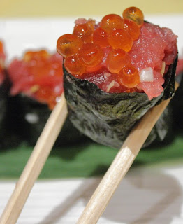Podemos aprovechar para aumentar nuestro consumo de pescado azul (omega 3) incorporando dentro de la hoja alga nori una mezcla de salmón ahumado con queso crema tipo philadelphia. Sólo hay que extender sobre la hoja y luego enrollar con las manos, primero humedeciendo las orillas de la hoja con un poquito de agua. También se pueden añadir un poco de huevas de salmón (caviar de salmón). Después hay que enfriar en la nevera y luego se puede cortar en ruedas (tipo Sushi) y llevar al trabajo o a donde sea (pues se come en frío). El rollo entero contiene aproximadamente 6,5 gramos de carbohidratos totales.