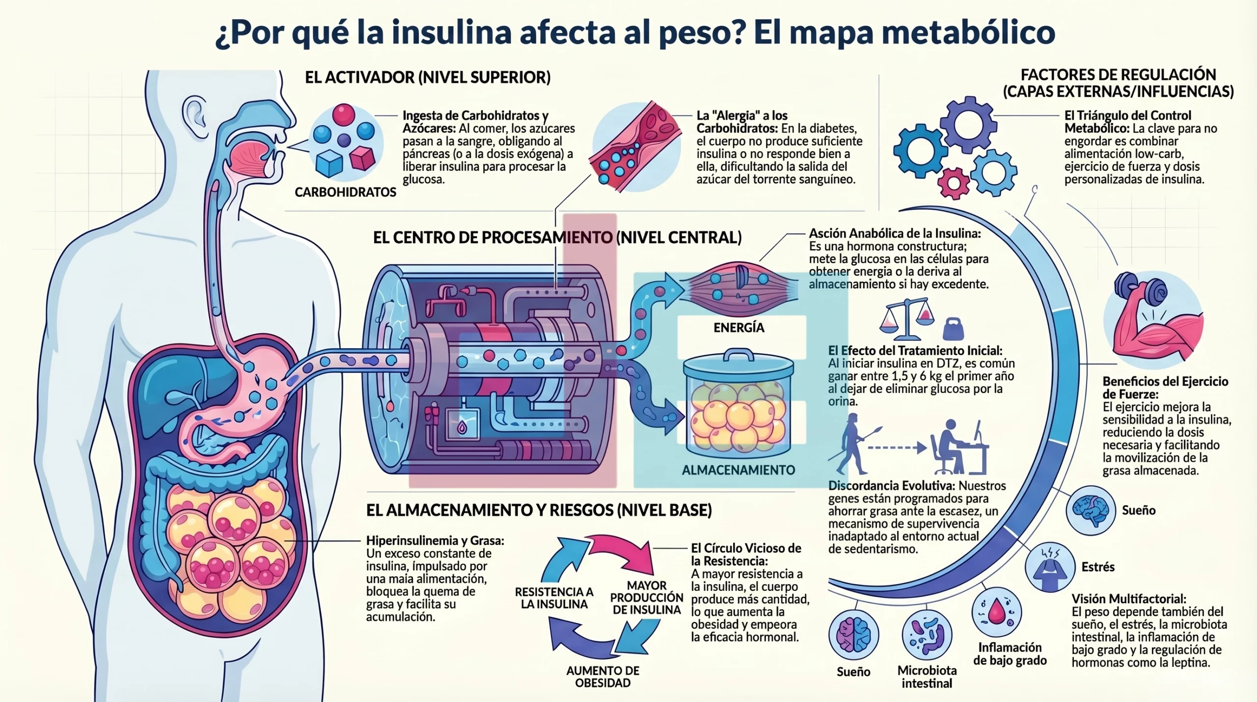 En este carácter multifactorial de la obesidad, la hiperinsulinemia es solo uno de muchos factores y, además, interactúa con los demás. Entre los factores que también contribuyen a la ganancia de peso o de grasa corporal están: la disbiosis intestinal, el exceso de carbohidratos en la alimentación que genera inflamación de bajo grado o silenciosa, el desequilibrio o la inadaptación metabólica, malos hábitos alimenticios (especialmente incoherentes con esta “alergia a los carbohidratos” que es la diabetes), la inactividad física, el estrés crónico, la falta de sueño reparador y otros factores personales como la edad y el sexo.