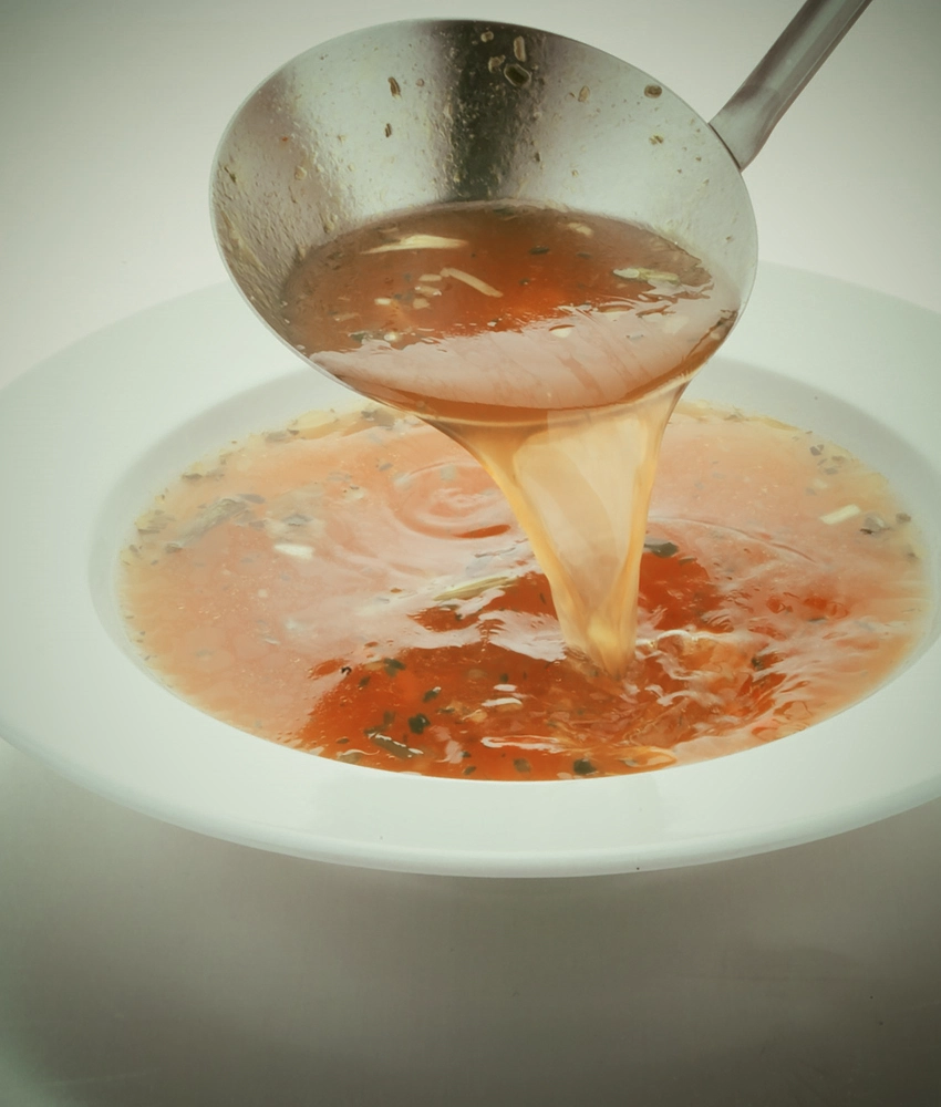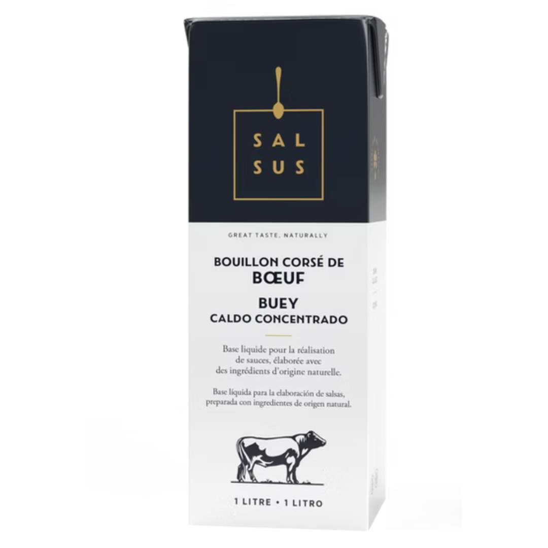 Cada litro de caldo es el resultado de 16 horas de lenta cocción, reduciendo cuidadosamente carne de buey asada junto a vegetales frescos (cebolla, zanahoria, puerro), concentrado de tomate y una mezcla exquisita de aromáticas especias como ajo, tomillo, enebro, pimienta negra, romero, laurel y clavo de olor. Esta dedicación consigue una textura sedosa y sabrosa que se vuelve ligeramente gelatinosa en frío, signo de la alta calidad del colágeno natural presente.